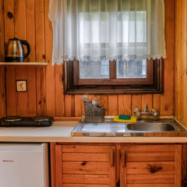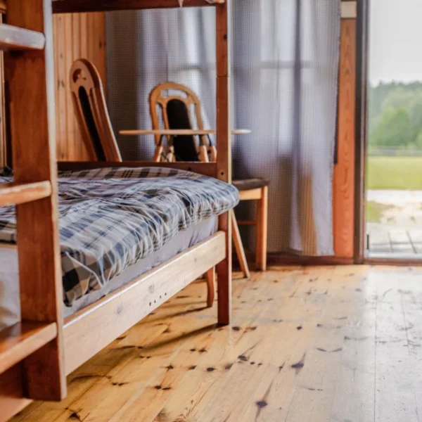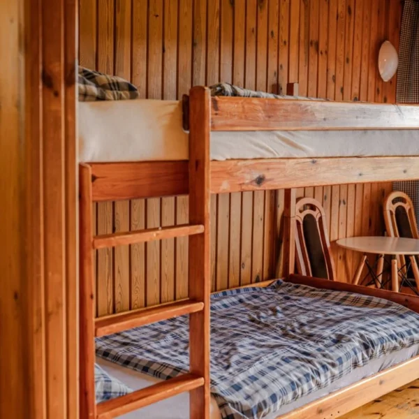 Każdy z naszych 7 domków ma powierzchnię ok 18m² i został zaprojektowany z myślą o komforcie i funkcjonalności. Wnętrze obejmuje dwie sypialnie z łóżkami piętrowymi, prywatną łazienkę z prysznicem oraz aneks kuchenny wyposażony w płytę grzewczą, lodówkę, czajnik, naczynia i sztućce.