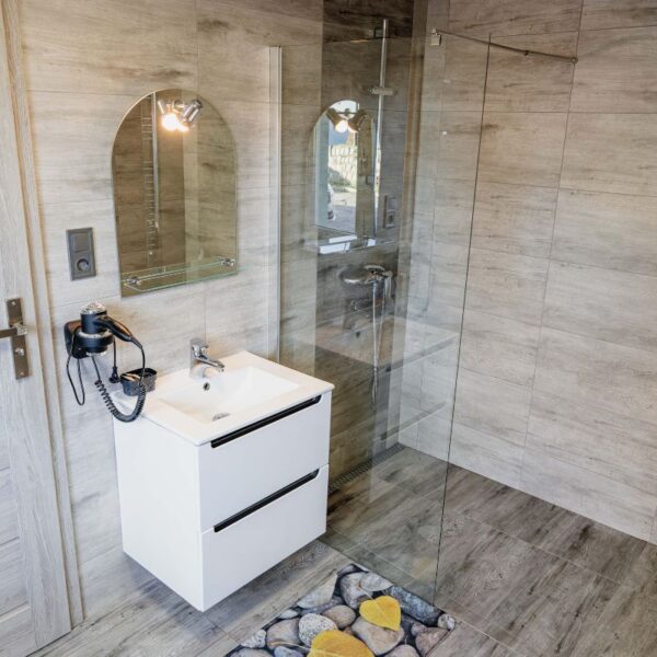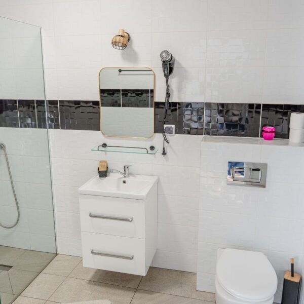 Każdy pokój posiada prywatną łazienkę z suszarka do włosów, a duże okna wpuszczają naturalne światło i widok na zieleń.